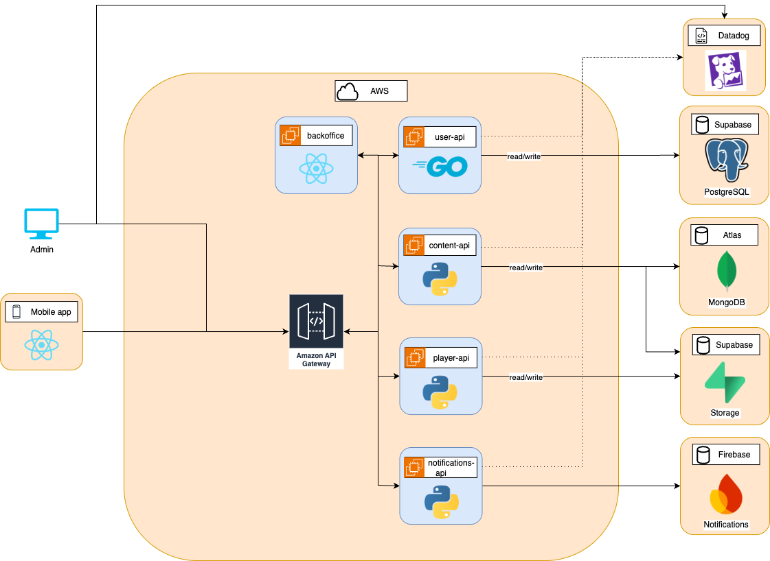 - Datadog: Recibe los logs de todos los servicios y se generan dashboards para mejorar la visibilidad sobre todo el sistema.